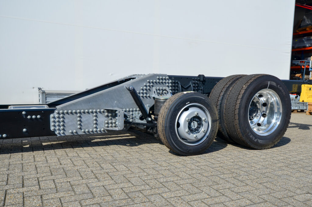 Onder een “chassisdrop” verstaan we het verlagen van het chassis tussen de versnellingsbak en aangedreven as. Door deze aanpassing is het mogelijk om hogere trucks te vervoeren.