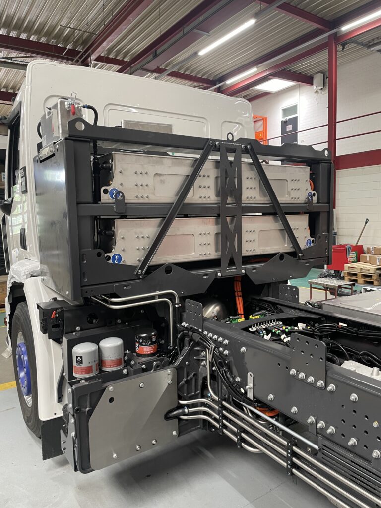 In nauwe samenwerking met de truckfabrikant heeft ESTEPE bij een reeks voertuigen de accupakketten aan de zijkant van het chassis verplaatst naar een positie achter de cabine.